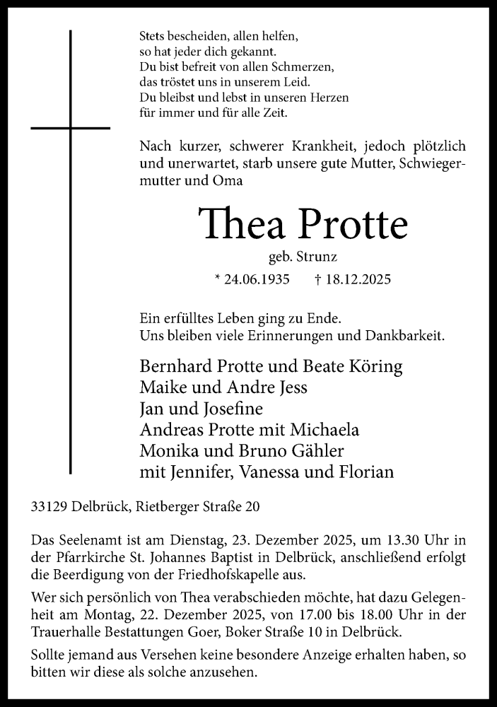 Hier finden Sie alle Traueranzeigen aus der Zeitung, die bisher für Thea Protte erschienen sind. Weitere Traueranzeigen, die in der Zeitung erscheinen, werden hier ebenfalls aufgelistet