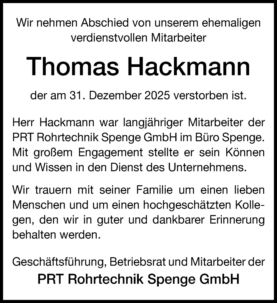 Hier finden Sie alle Traueranzeigen aus der Zeitung, die bisher für Thomas Hackmann erschienen sind. Weitere Traueranzeigen, die in der Zeitung erscheinen, werden hier ebenfalls aufgelistet