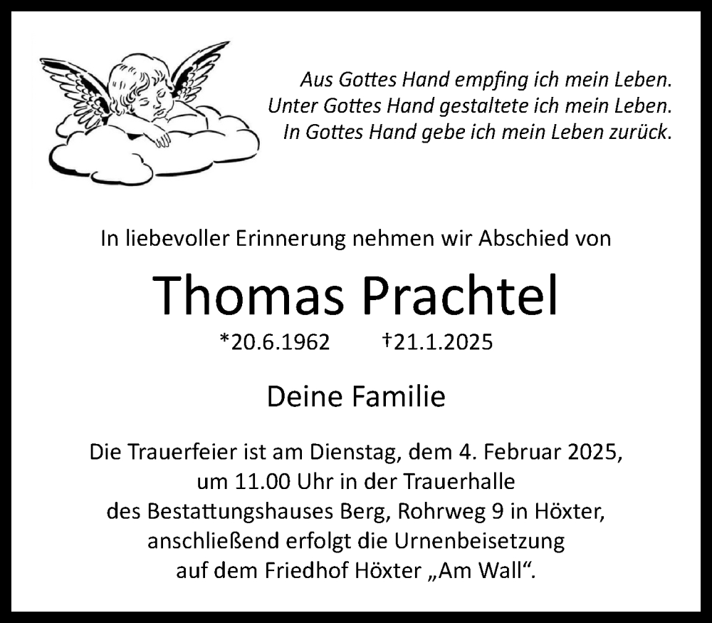 Hier finden Sie alle Traueranzeigen aus der Zeitung, die bisher für Thomas Prachtel erschienen sind. Weitere Traueranzeigen, die in der Zeitung erscheinen, werden hier ebenfalls aufgelistet