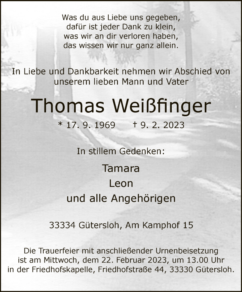 Hier finden Sie alle Traueranzeigen aus der Zeitung, die bisher für Thomas Weißfinger erschienen sind. Weitere Traueranzeigen, die in der Zeitung erscheinen, werden hier ebenfalls aufgelistet
