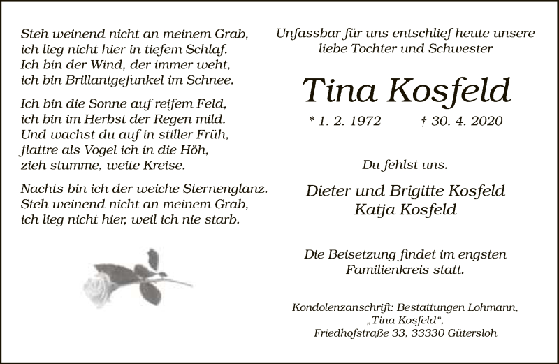 Hier finden Sie alle Traueranzeigen aus der Zeitung, die bisher für Tina Kosfeld erschienen sind. Weitere Traueranzeigen, die in der Zeitung erscheinen, werden hier ebenfalls aufgelistet