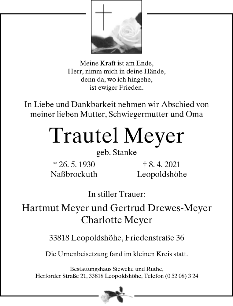 Hier finden Sie alle Traueranzeigen aus der Zeitung, die bisher für Trautel Meyer erschienen sind. Weitere Traueranzeigen, die in der Zeitung erscheinen, werden hier ebenfalls aufgelistet