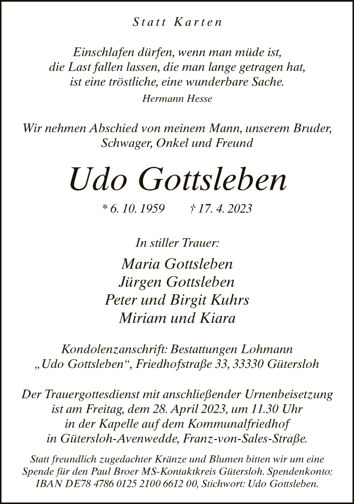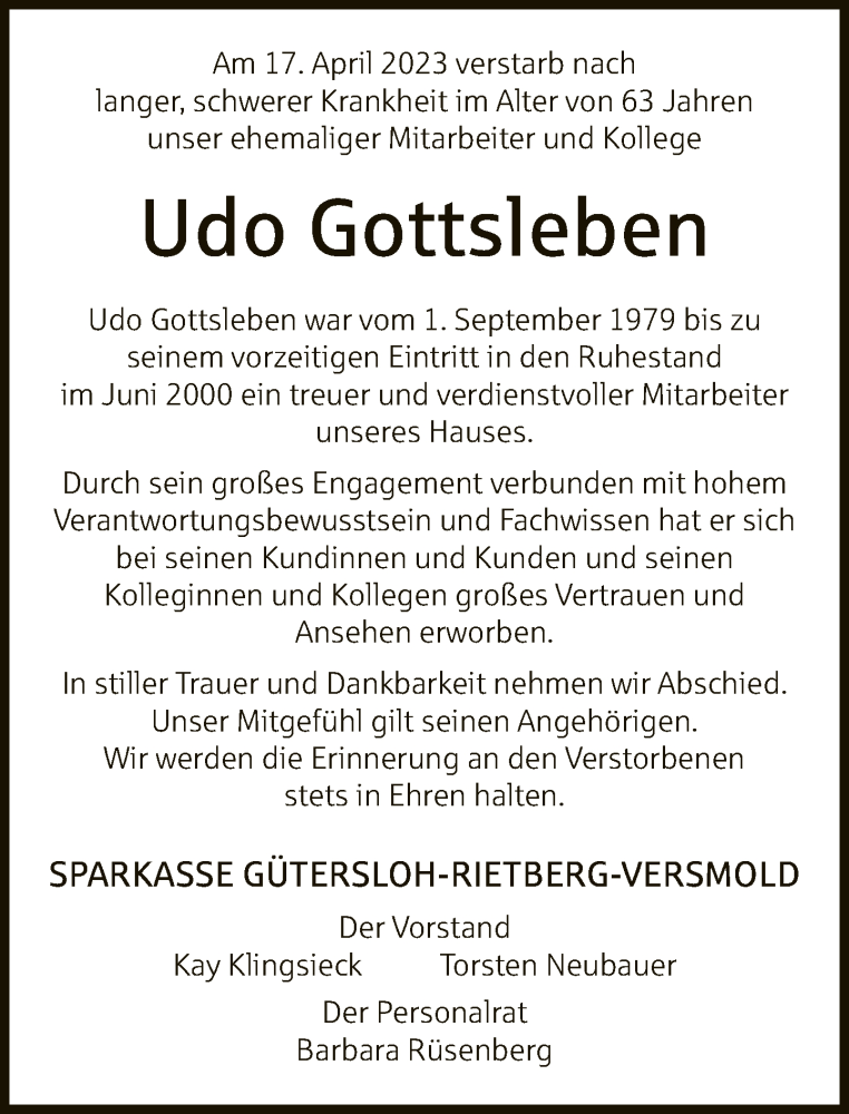 Hier finden Sie alle Traueranzeigen aus der Zeitung, die bisher für Udo Gottsleben erschienen sind. Weitere Traueranzeigen, die in der Zeitung erscheinen, werden hier ebenfalls aufgelistet