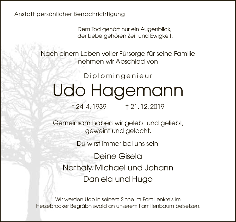 Hier finden Sie alle Traueranzeigen aus der Zeitung, die bisher für Udo Hagemann erschienen sind. Weitere Traueranzeigen, die in der Zeitung erscheinen, werden hier ebenfalls aufgelistet