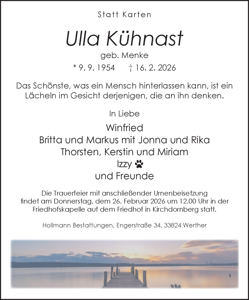 Hier finden Sie alle Traueranzeigen aus der Zeitung, die bisher für Ulla Kühnast erschienen sind. Weitere Traueranzeigen, die in der Zeitung erscheinen, werden hier ebenfalls aufgelistet