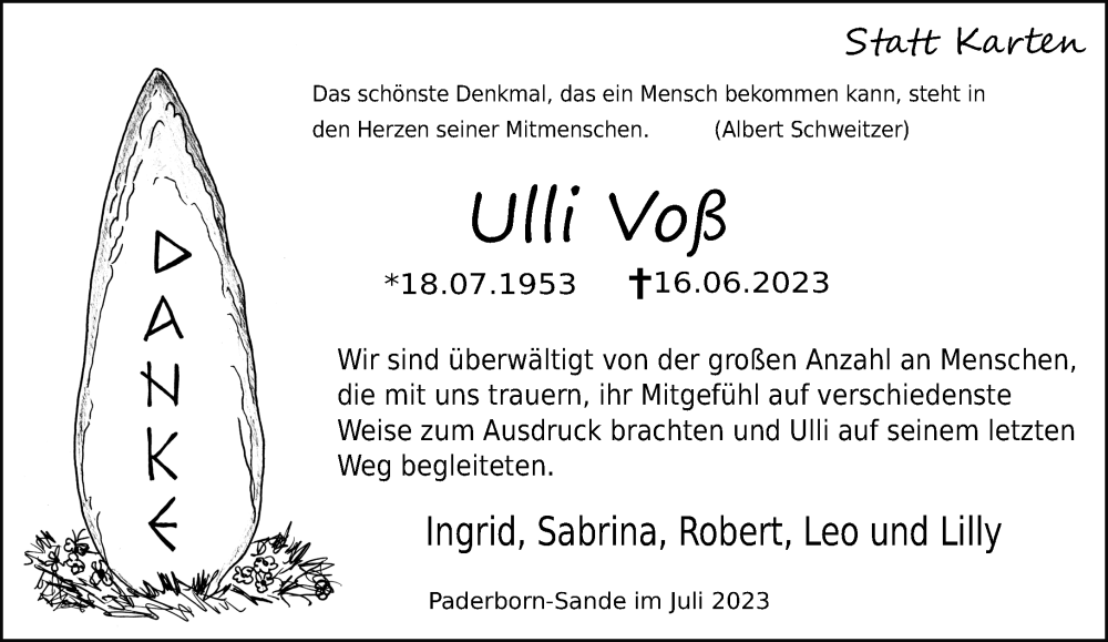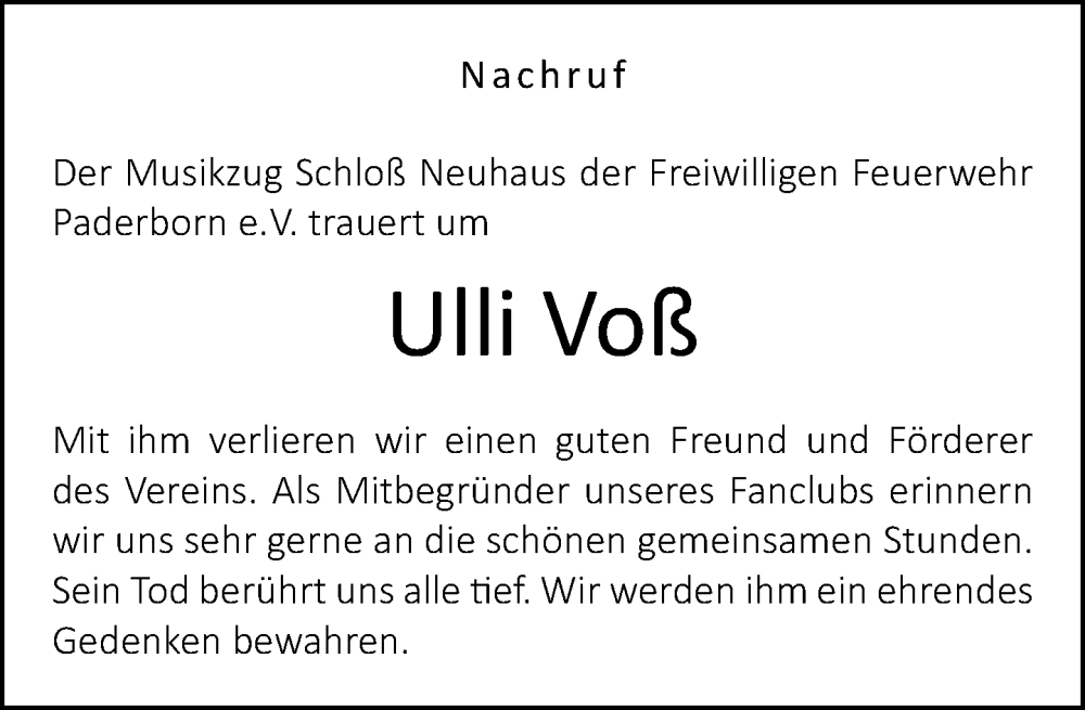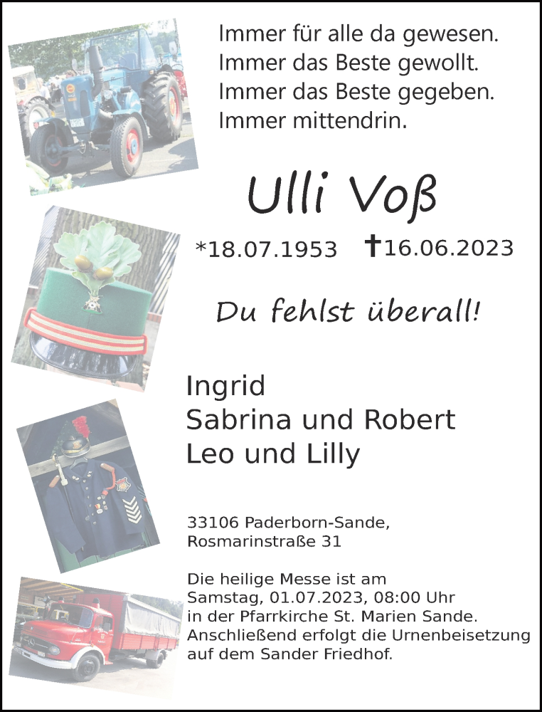 Hier finden Sie alle Traueranzeigen aus der Zeitung, die bisher für Ulli Voß erschienen sind. Weitere Traueranzeigen, die in der Zeitung erscheinen, werden hier ebenfalls aufgelistet