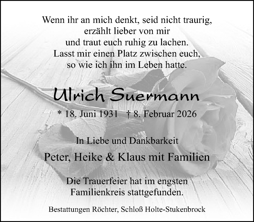 Hier finden Sie alle Traueranzeigen aus der Zeitung, die bisher für Ulrich Suermann erschienen sind. Weitere Traueranzeigen, die in der Zeitung erscheinen, werden hier ebenfalls aufgelistet