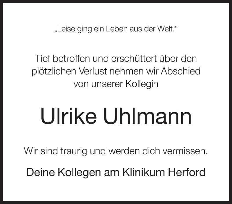 Hier finden Sie alle Traueranzeigen aus der Zeitung, die bisher für Ulrike Uhlmann erschienen sind. Weitere Traueranzeigen, die in der Zeitung erscheinen, werden hier ebenfalls aufgelistet