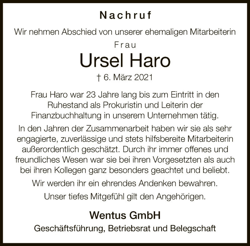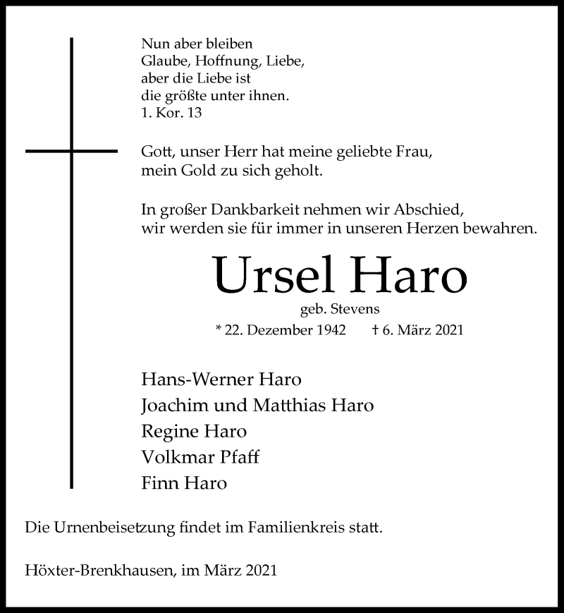 Hier finden Sie alle Traueranzeigen aus der Zeitung, die bisher für Ursel Haro erschienen sind. Weitere Traueranzeigen, die in der Zeitung erscheinen, werden hier ebenfalls aufgelistet