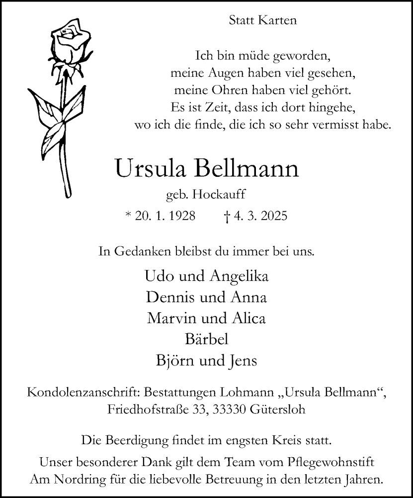 Hier finden Sie alle Traueranzeigen aus der Zeitung, die bisher für Ursula Bellmann erschienen sind. Weitere Traueranzeigen, die in der Zeitung erscheinen, werden hier ebenfalls aufgelistet