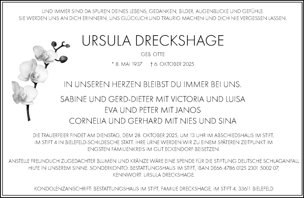 Hier finden Sie alle Traueranzeigen aus der Zeitung, die bisher für Ursula Dreckshage erschienen sind. Weitere Traueranzeigen, die in der Zeitung erscheinen, werden hier ebenfalls aufgelistet