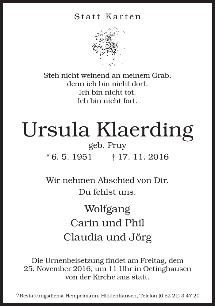 Hier finden Sie alle Traueranzeigen aus der Zeitung, die bisher für Ursula Klaerding erschienen sind. Weitere Traueranzeigen, die in der Zeitung erscheinen, werden hier ebenfalls aufgelistet