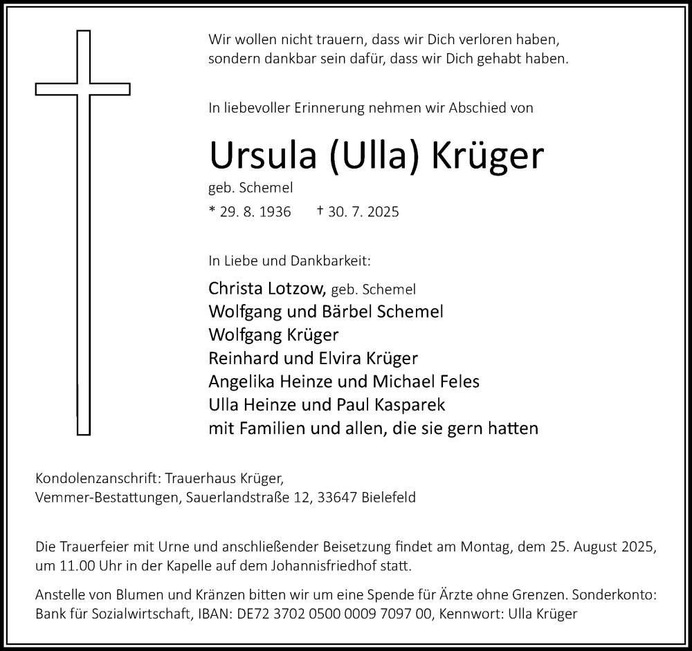Hier finden Sie alle Traueranzeigen aus der Zeitung, die bisher für Ursula Krüger erschienen sind. Weitere Traueranzeigen, die in der Zeitung erscheinen, werden hier ebenfalls aufgelistet