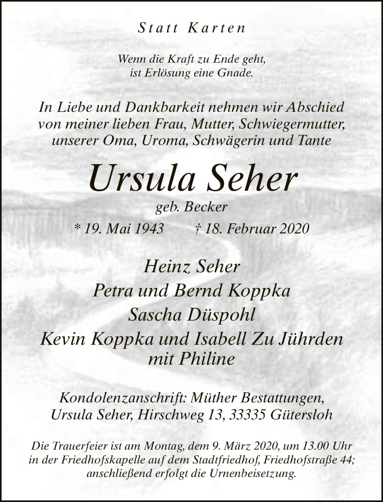 Hier finden Sie alle Traueranzeigen aus der Zeitung, die bisher für Ursula Seher erschienen sind. Weitere Traueranzeigen, die in der Zeitung erscheinen, werden hier ebenfalls aufgelistet