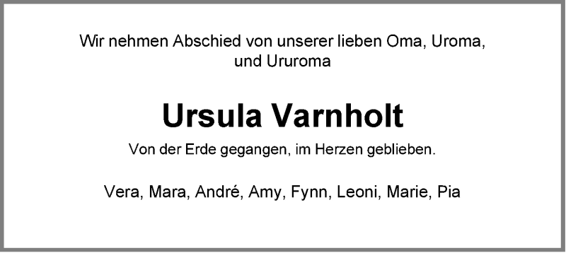 Hier finden Sie alle Traueranzeigen aus der Zeitung, die bisher für Ursula Varnholt erschienen sind. Weitere Traueranzeigen, die in der Zeitung erscheinen, werden hier ebenfalls aufgelistet