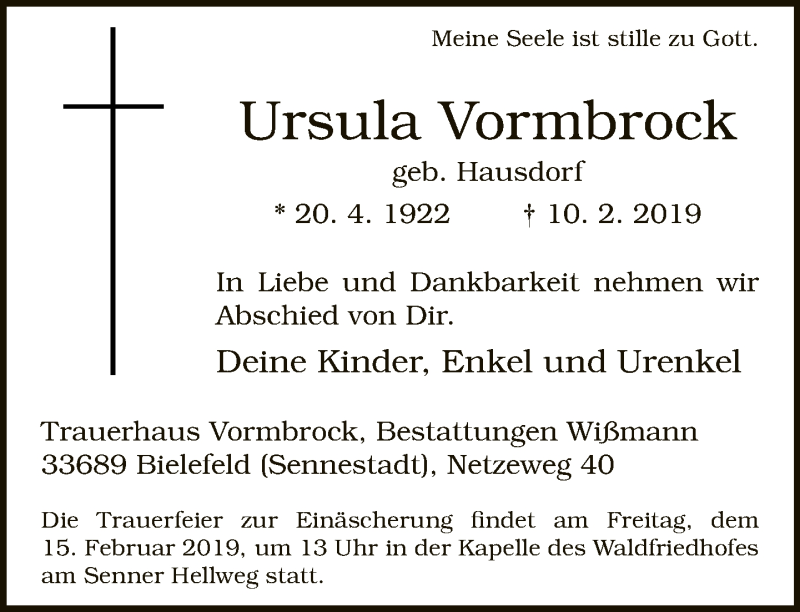 Hier finden Sie alle Traueranzeigen aus der Zeitung, die bisher für Ursula Vormbrock erschienen sind. Weitere Traueranzeigen, die in der Zeitung erscheinen, werden hier ebenfalls aufgelistet