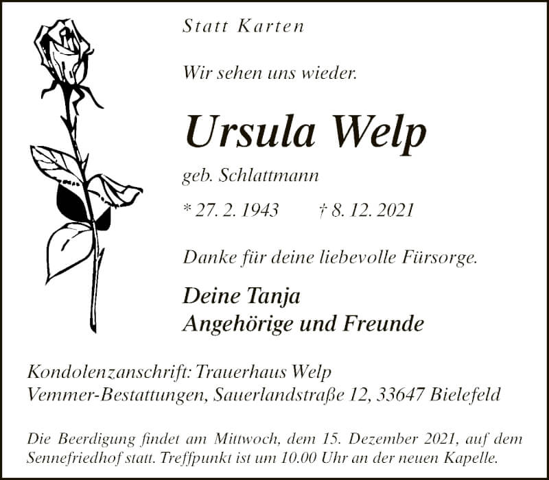 Hier finden Sie alle Traueranzeigen aus der Zeitung, die bisher für Ursula Welp erschienen sind. Weitere Traueranzeigen, die in der Zeitung erscheinen, werden hier ebenfalls aufgelistet