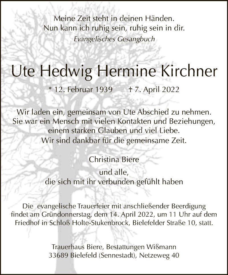 Hier finden Sie alle Traueranzeigen aus der Zeitung, die bisher für Ute Hedwig Hermine Kirchner erschienen sind. Weitere Traueranzeigen, die in der Zeitung erscheinen, werden hier ebenfalls aufgelistet
