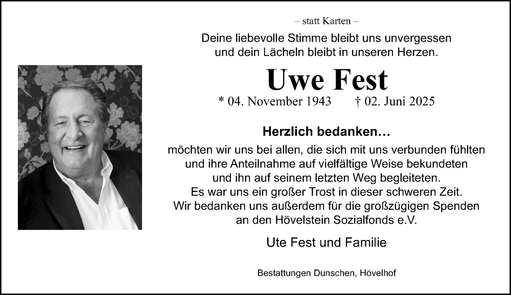 Hier finden Sie alle Traueranzeigen aus der Zeitung, die bisher für Uwe Fest erschienen sind. Weitere Traueranzeigen, die in der Zeitung erscheinen, werden hier ebenfalls aufgelistet