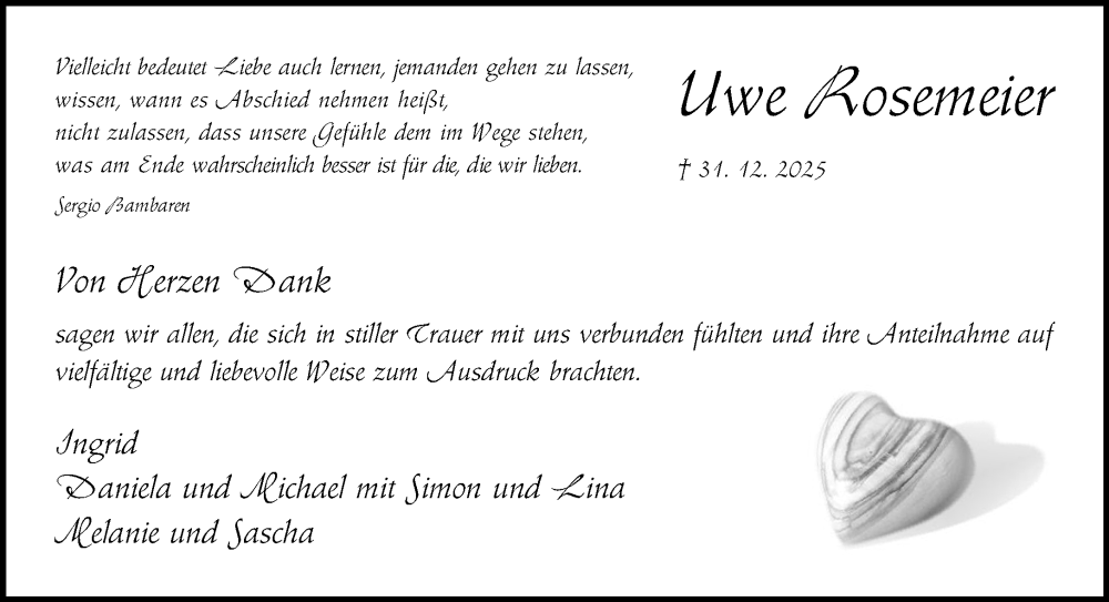 Hier finden Sie alle Traueranzeigen aus der Zeitung, die bisher für Uwe Rosemeier erschienen sind. Weitere Traueranzeigen, die in der Zeitung erscheinen, werden hier ebenfalls aufgelistet