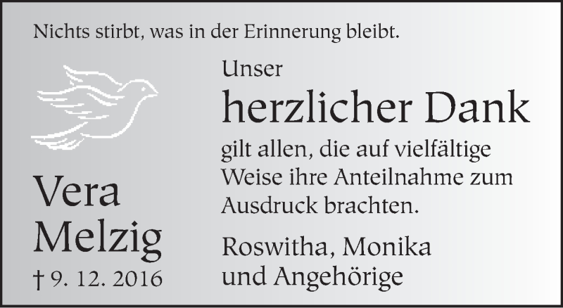 Hier finden Sie alle Traueranzeigen aus der Zeitung, die bisher für Vera Melzig erschienen sind. Weitere Traueranzeigen, die in der Zeitung erscheinen, werden hier ebenfalls aufgelistet