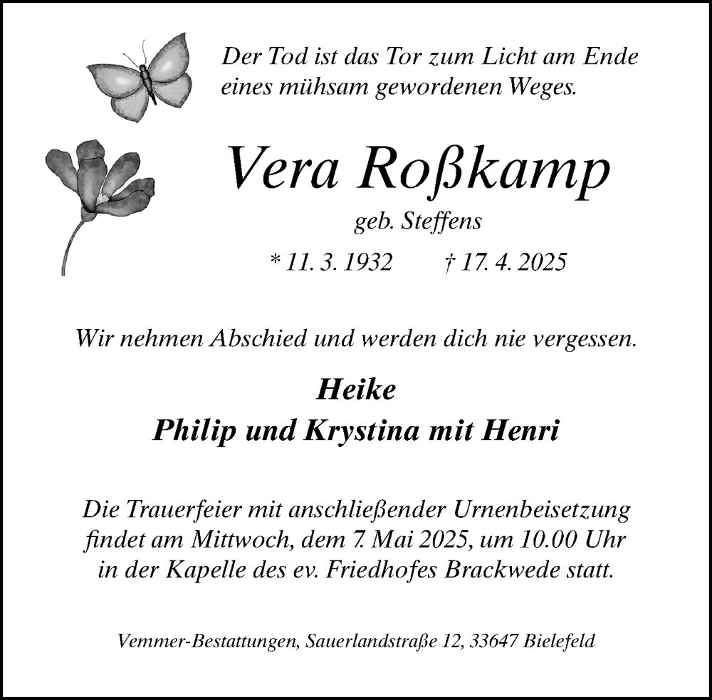 Hier finden Sie alle Traueranzeigen aus der Zeitung, die bisher für Vera Roßkamp erschienen sind. Weitere Traueranzeigen, die in der Zeitung erscheinen, werden hier ebenfalls aufgelistet