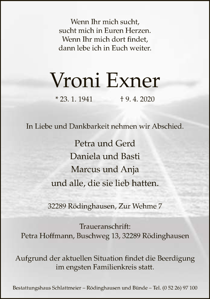 Hier finden Sie alle Traueranzeigen aus der Zeitung, die bisher für Vroni Exner erschienen sind. Weitere Traueranzeigen, die in der Zeitung erscheinen, werden hier ebenfalls aufgelistet