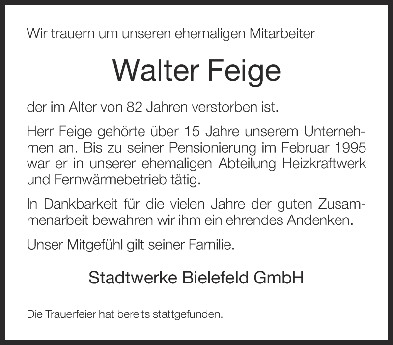 Hier finden Sie alle Traueranzeigen aus der Zeitung, die bisher für Walter Feige erschienen sind. Weitere Traueranzeigen, die in der Zeitung erscheinen, werden hier ebenfalls aufgelistet