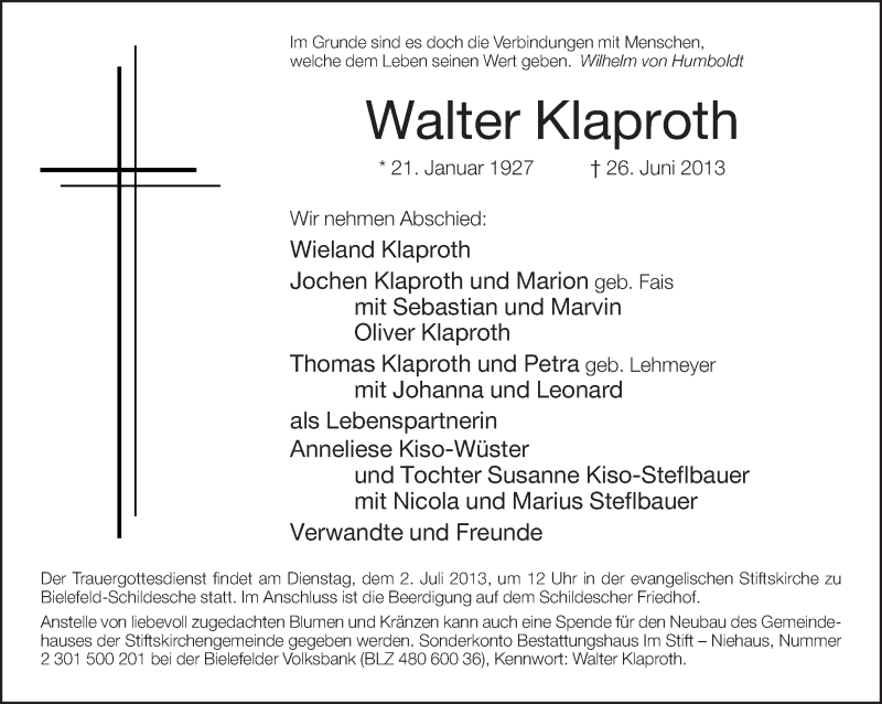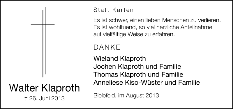 Hier finden Sie alle Traueranzeigen aus der Zeitung, die bisher für Walter Klaproth erschienen sind. Weitere Traueranzeigen, die in der Zeitung erscheinen, werden hier ebenfalls aufgelistet