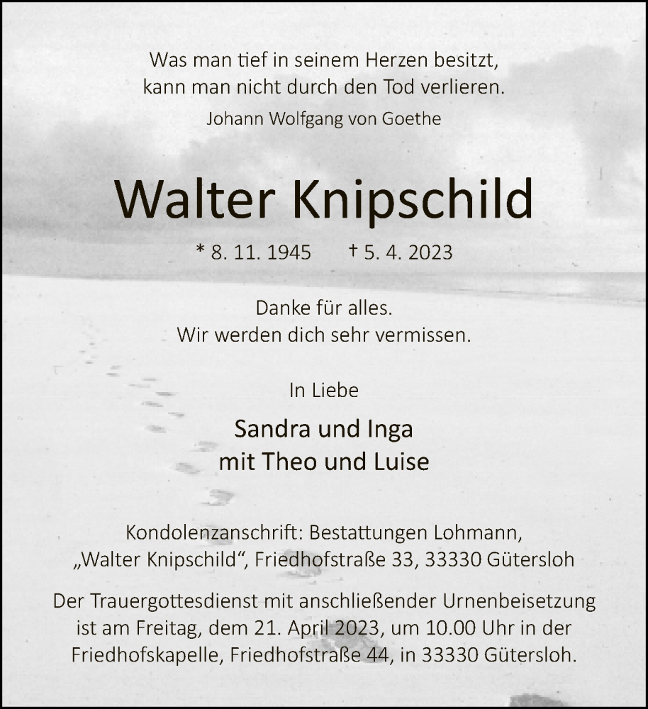 Hier finden Sie alle Traueranzeigen aus der Zeitung, die bisher für Walter Knipschild erschienen sind. Weitere Traueranzeigen, die in der Zeitung erscheinen, werden hier ebenfalls aufgelistet