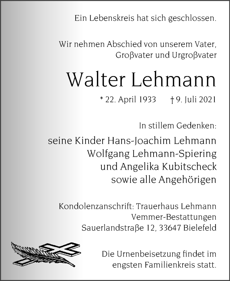Hier finden Sie alle Traueranzeigen aus der Zeitung, die bisher für Walter Lehmann erschienen sind. Weitere Traueranzeigen, die in der Zeitung erscheinen, werden hier ebenfalls aufgelistet