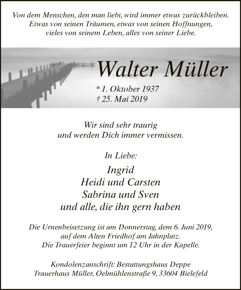 Hier finden Sie alle Traueranzeigen aus der Zeitung, die bisher für Walter Müller erschienen sind. Weitere Traueranzeigen, die in der Zeitung erscheinen, werden hier ebenfalls aufgelistet