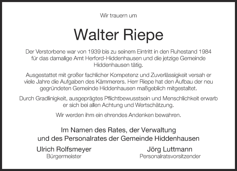 Hier finden Sie alle Traueranzeigen aus der Zeitung, die bisher für Walter Riepe erschienen sind. Weitere Traueranzeigen, die in der Zeitung erscheinen, werden hier ebenfalls aufgelistet