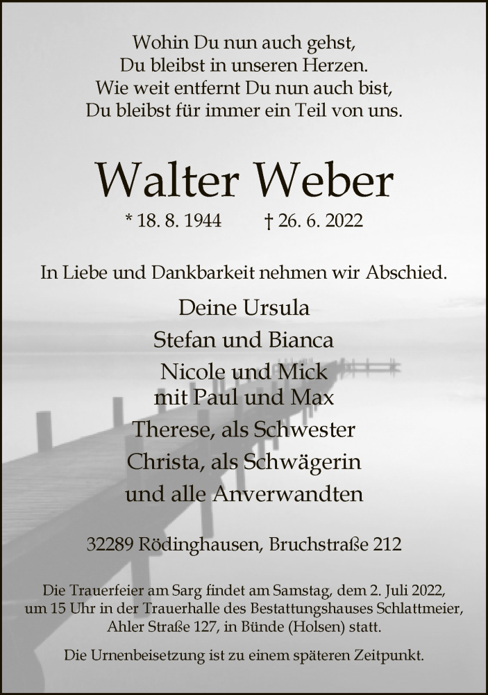 Hier finden Sie alle Traueranzeigen aus der Zeitung, die bisher für Walter Weber erschienen sind. Weitere Traueranzeigen, die in der Zeitung erscheinen, werden hier ebenfalls aufgelistet
