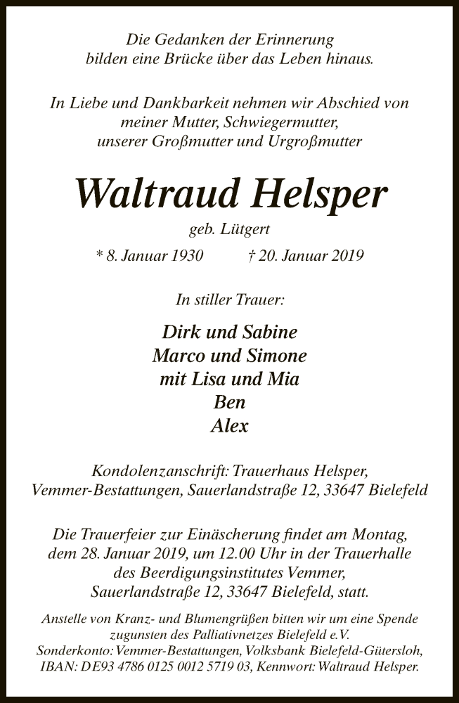 Hier finden Sie alle Traueranzeigen aus der Zeitung, die bisher für Waltraud Helsper erschienen sind. Weitere Traueranzeigen, die in der Zeitung erscheinen, werden hier ebenfalls aufgelistet