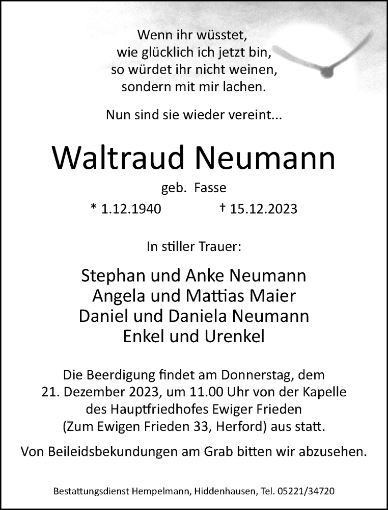 Hier finden Sie alle Traueranzeigen aus der Zeitung, die bisher für Waltraud Neumann erschienen sind. Weitere Traueranzeigen, die in der Zeitung erscheinen, werden hier ebenfalls aufgelistet