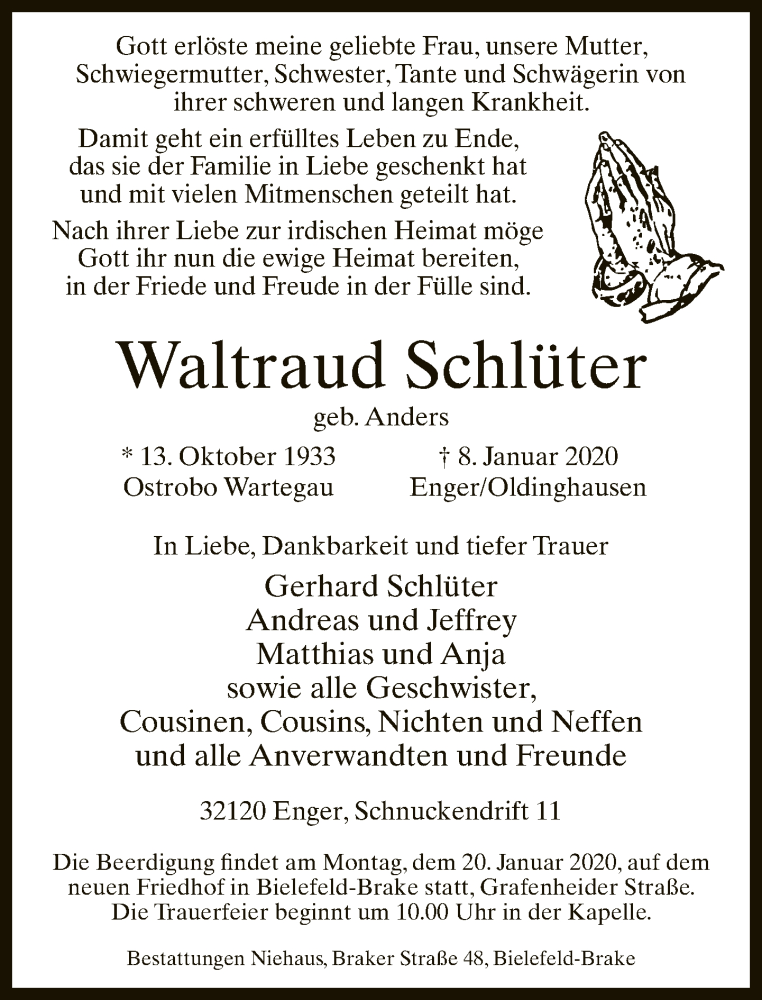 Hier finden Sie alle Traueranzeigen aus der Zeitung, die bisher für Waltraud Schlüter erschienen sind. Weitere Traueranzeigen, die in der Zeitung erscheinen, werden hier ebenfalls aufgelistet