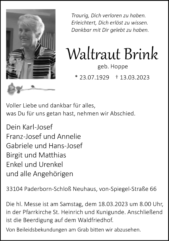 Hier finden Sie alle Traueranzeigen aus der Zeitung, die bisher für Waltraut Brink erschienen sind. Weitere Traueranzeigen, die in der Zeitung erscheinen, werden hier ebenfalls aufgelistet
