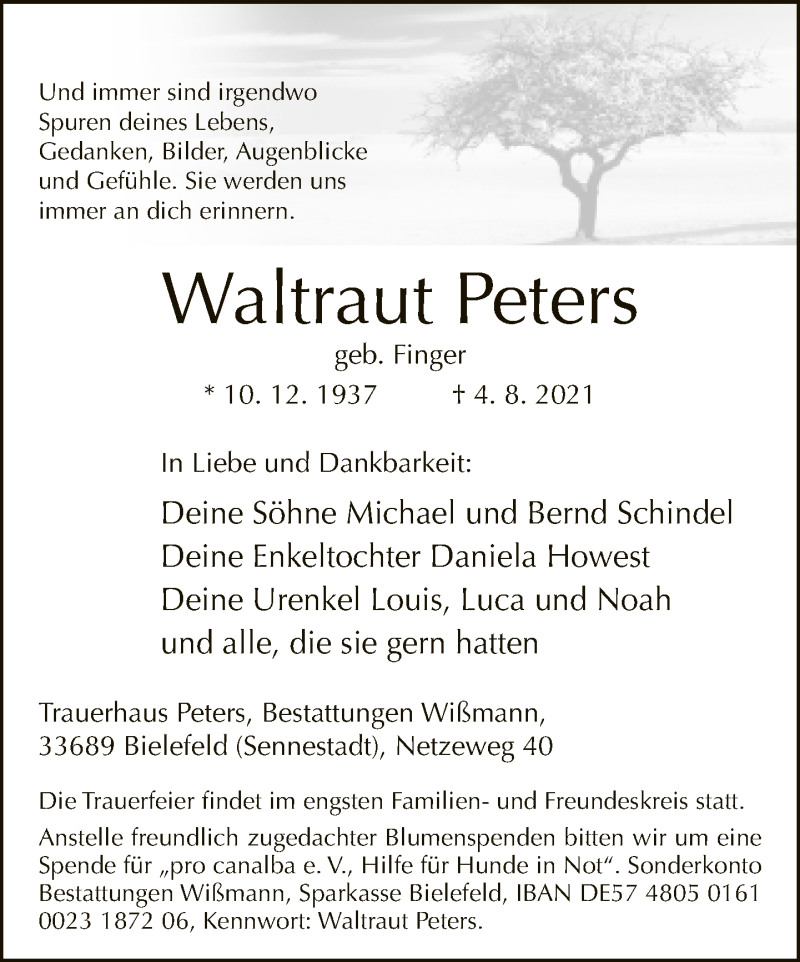 Hier finden Sie alle Traueranzeigen aus der Zeitung, die bisher für Waltraut Peters erschienen sind. Weitere Traueranzeigen, die in der Zeitung erscheinen, werden hier ebenfalls aufgelistet