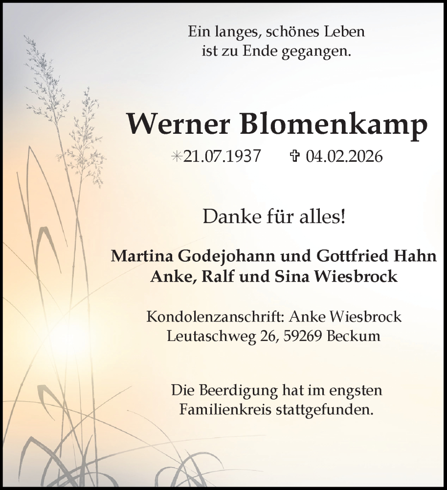 Hier finden Sie alle Traueranzeigen aus der Zeitung, die bisher für Werner Blomenkamp erschienen sind. Weitere Traueranzeigen, die in der Zeitung erscheinen, werden hier ebenfalls aufgelistet