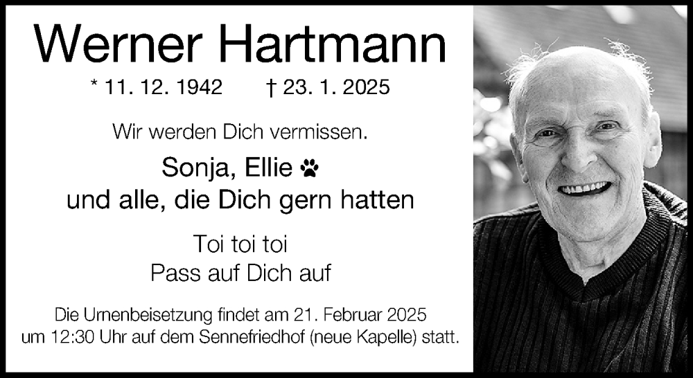 Hier finden Sie alle Traueranzeigen aus der Zeitung, die bisher für Werner Hartmann erschienen sind. Weitere Traueranzeigen, die in der Zeitung erscheinen, werden hier ebenfalls aufgelistet
