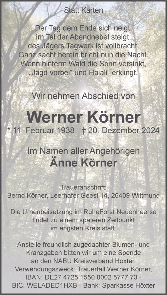 Hier finden Sie alle Traueranzeigen aus der Zeitung, die bisher für Werner Körner erschienen sind. Weitere Traueranzeigen, die in der Zeitung erscheinen, werden hier ebenfalls aufgelistet
