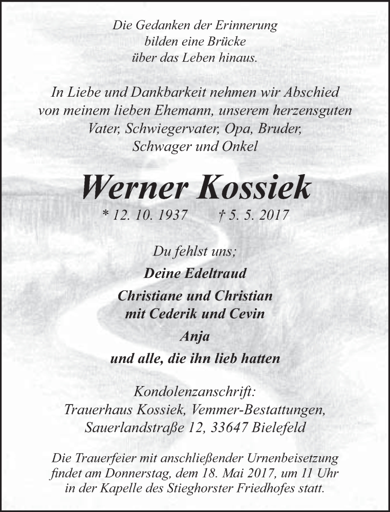 Hier finden Sie alle Traueranzeigen aus der Zeitung, die bisher für Werner Kossiek erschienen sind. Weitere Traueranzeigen, die in der Zeitung erscheinen, werden hier ebenfalls aufgelistet