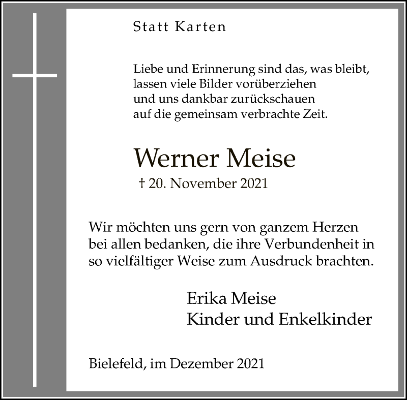 Hier finden Sie alle Traueranzeigen aus der Zeitung, die bisher für Werner Meise erschienen sind. Weitere Traueranzeigen, die in der Zeitung erscheinen, werden hier ebenfalls aufgelistet