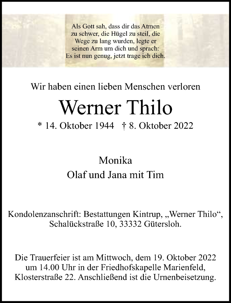 Hier finden Sie alle Traueranzeigen aus der Zeitung, die bisher für Werner Thilo erschienen sind. Weitere Traueranzeigen, die in der Zeitung erscheinen, werden hier ebenfalls aufgelistet