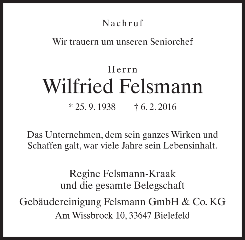Hier finden Sie alle Traueranzeigen aus der Zeitung, die bisher für Wilfried Felsmann erschienen sind. Weitere Traueranzeigen, die in der Zeitung erscheinen, werden hier ebenfalls aufgelistet