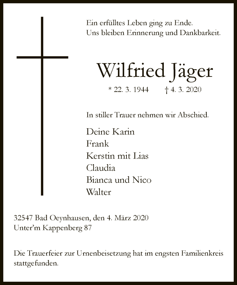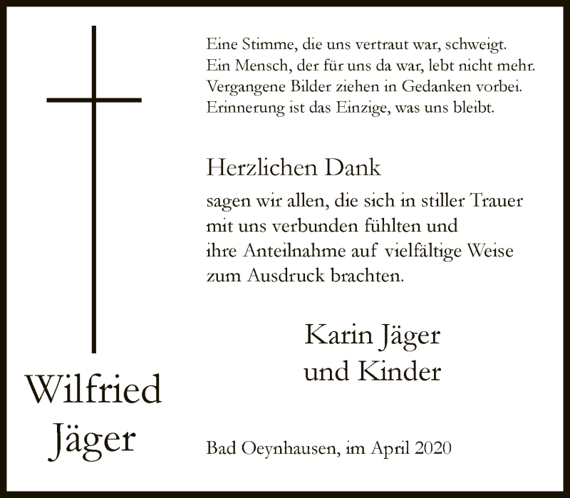 Hier finden Sie alle Traueranzeigen aus der Zeitung, die bisher für Wilfried Jäger erschienen sind. Weitere Traueranzeigen, die in der Zeitung erscheinen, werden hier ebenfalls aufgelistet