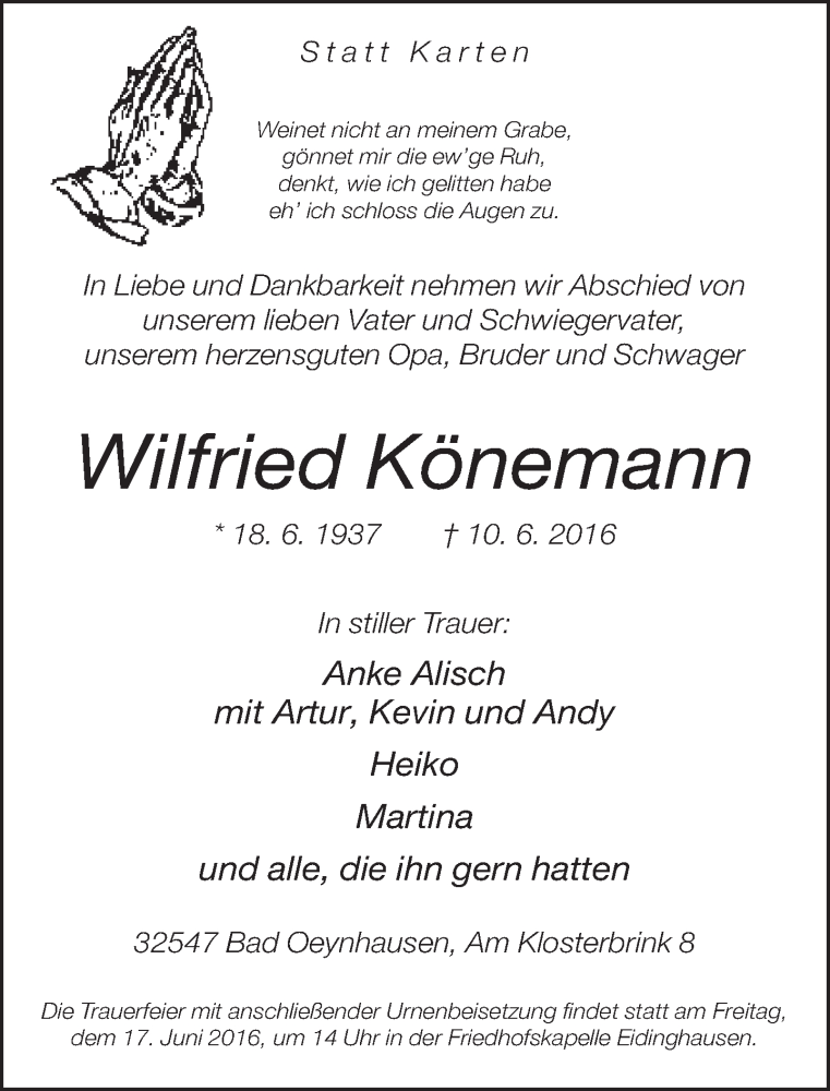 Hier finden Sie alle Traueranzeigen aus der Zeitung, die bisher für Wilfried Könemann erschienen sind. Weitere Traueranzeigen, die in der Zeitung erscheinen, werden hier ebenfalls aufgelistet