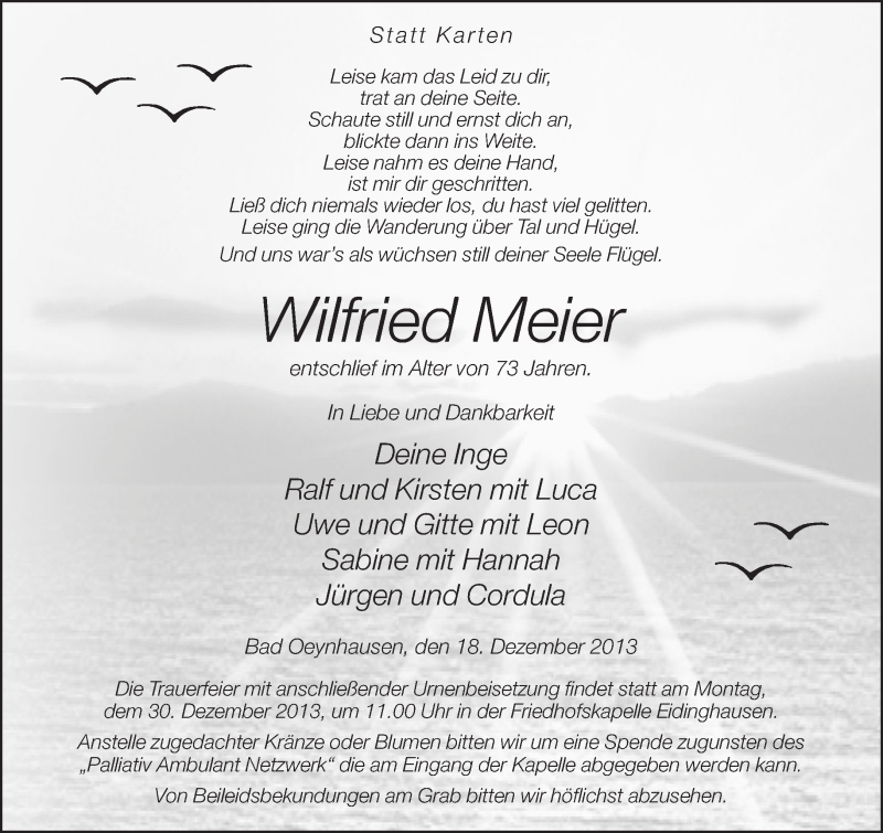 Hier finden Sie alle Traueranzeigen aus der Zeitung, die bisher für Wilfried Meier erschienen sind. Weitere Traueranzeigen, die in der Zeitung erscheinen, werden hier ebenfalls aufgelistet