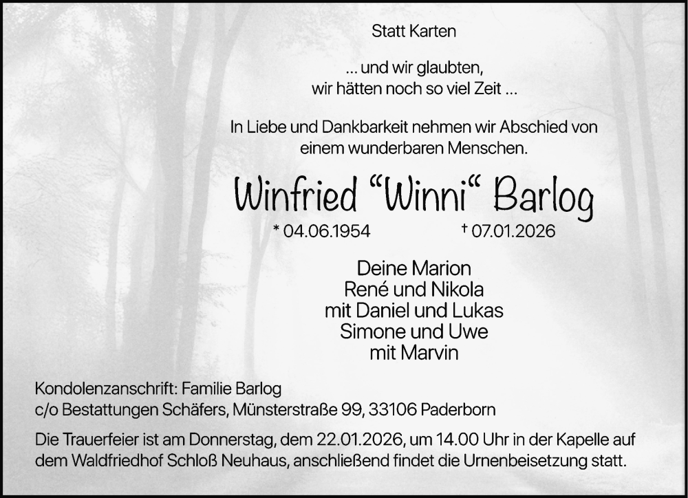 Hier finden Sie alle Traueranzeigen aus der Zeitung, die bisher für Winfried Barlog erschienen sind. Weitere Traueranzeigen, die in der Zeitung erscheinen, werden hier ebenfalls aufgelistet